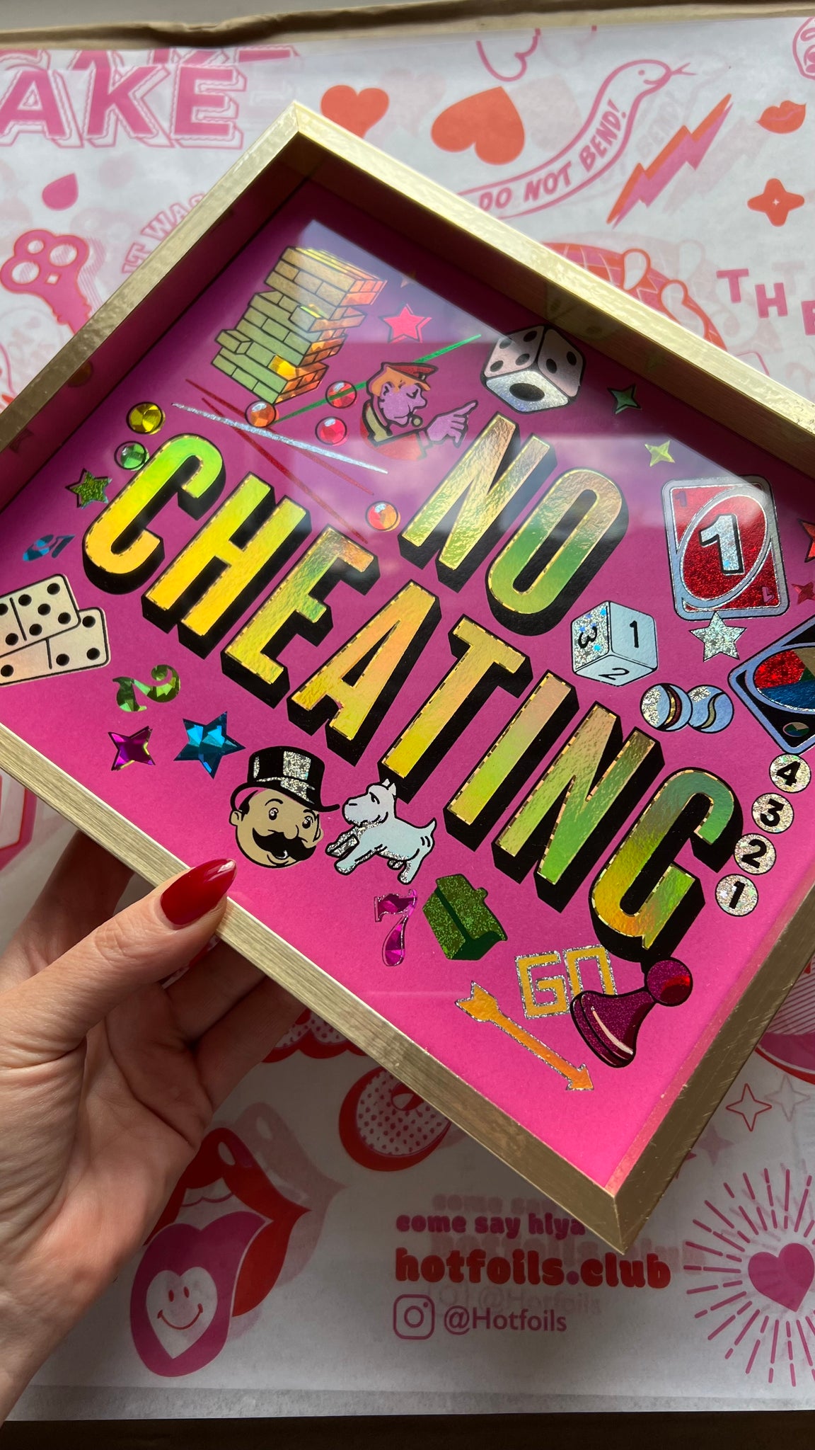 All Hotfoils come delivered flat in biodegradable cornstarch sleeves and include Hotfoils postcard and reusable glitzy stickers.